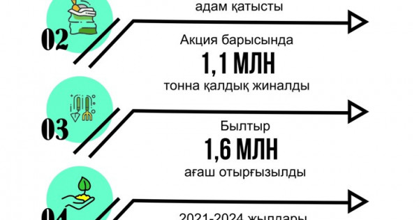 بىلتىر «تازا قازاقستان» اكتسياسىنا 6,2 ملن ادام قاتىستى. اكتسيا بارىسىندا 1,1 ملن توننا قالدىق جينالىپ, 1,6 ملن اعاش وتىرعىزىلدى. ەكولوگيا جانە تابيعي رەسۋرستار ءمينيسترى ەرلان نىسانباەۆ مەملەكەت باسشىسىنىڭ 2027 جىلعا دەيىن 2 ملرد اعاش وتىرعىزۋ جونىندەگى تاپسىرماسىنا سايكەس, 2025 جىلعا ارنالعان جوسپار بويىنشا 494 مىڭ گەكتار القاپقا 336,5 ملن كوشەت وتىرعىزىلعانىن ايتتى. سونىمەن قاتار 2021–2024 جىلدارى 1,1 ملرد-تان استام اعاش ەگىلگەن.