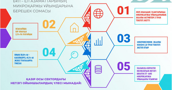 قارجى نارىعىن رەتتەۋ جانە دامىتۋ اگەنتتىگىنىڭ (قنردا) دەرەكتەرىنە سۇيەنسەك, ميكروقارجى ۇيىمدارىنىڭ جالپى اكتيۆتەرى 2025 جىلدىڭ 1 قاڭتارىندا 3 ترلن تەڭگەگە جەتىپ, ءبىر جىلدا 2,1%-عا ۇلعايعان. بۇل ءوسىم ەڭ الدىمەن, نەسيە پورتفەلىنىڭ ارتۋىنا بايلانىستى. قازىر وسى سەكتورداعى نەگىزگى ويىنشىلاردىڭ ۇلەسى مىناداي: 57,4%-ى ميكروقارجى ۇيىمدارىنا (1,7 ترلن تەڭگە), 29,6%-ى نەسيە سەرىكتەستىكتەرىنە (0,9 ترلن تەڭگە), 13,1%-ى لومباردتارعا (0,4 ترلن تەڭگە) تيەسىلى.