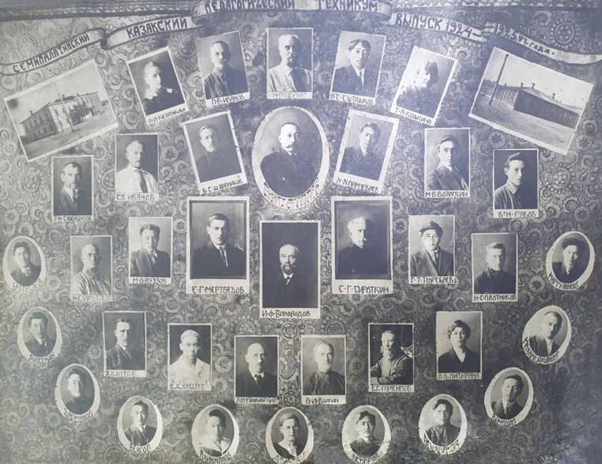 ال وقىتۋشىلارعا كەلسەك, وندا سەمەيدىڭ قازاق پەداگوگيكالىق تەحنيكۋمىنىڭ ديرەكتورى, بۇرىنعى مۇعالىمدەر سەمينارياسىنىڭ تۇلەگى, اعارتۋشى-پەداگوگ, الاش قايراتكەرى ابىكەي ساتباەۆ, لەنينگراد مەملەكەتتىك ۋنيۆەرسيتەتىنىڭ فيلولوگيا فاكۋلتەتىنىڭ ستۋدەنتى (1923–1928), ايگىلى جازۋشى مۇحتار اۋەزوۆ, عۇلاما عالىم قانىش ساتباەۆتىڭ بولاشاق جارى تايسيا الەكسەەۆنا كوشكينا, سەمەي قازاق تەاترىنىڭ نەگىزىن قالاعان, سەمەيدىڭ قازاق پەداگوگيكالىق تەحنيكۋمىندا ۇزاق جىلدار قازاق ءتىلى مەن ادەبيەتى پانىنەن ساباق بەرگەن عالياقپار تورەباەۆ, پەداگوگ-عالىم, ى.التىنسارين اتىندىعى عىلىمي زەرتتەۋ ينستيتۋتىنىڭ ديرەكتورى ءامىرجان سىدىقوۆ بەينەسى ساقتالعان. سونىمەن قاتار رەسەي ۋنيۆەرسيتەتتەرى مەن ينستيتۋتتارىن بىتىرگەن وقىتۋشىلار ە.گ.مەرتۆەتسوۆ, س.گ.سيروتكين, ي.ف.ۆينوحودوۆ, ە.گ.گەراسيموۆ بار.