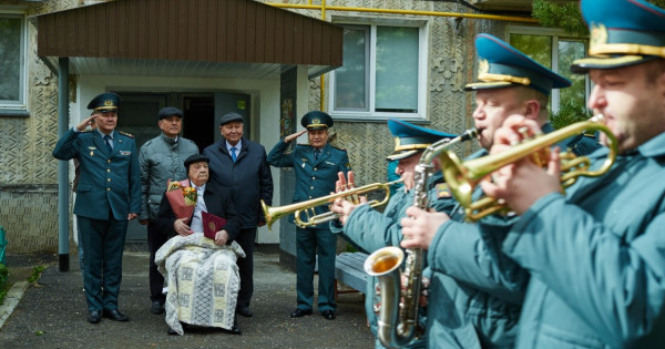 98 جاستاعى مايدانگەردىڭ ءۇيىنىڭ الدىندا ەسەپتىك توپ ساپتىق شەرۋمەن ءجۇرىپ ءوتتى. ولاردى اسكەري وركەستر سۇيەمەلدەدى. مايداندا تانكيست بولعان قاريا جاستارعا سوعىس جىلدارىنىڭ سۇراپىل تۇستارىن ايتىپ بەردى.