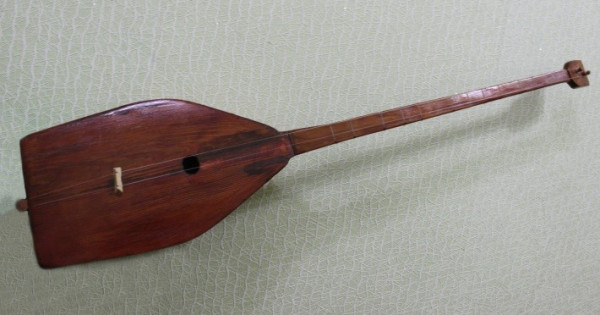 دومبىرا ەكى ىشەكتى, قايىڭنان جاسالعان. مويىن ۇزىندىعى – 48 سم, شاناعى – 32 سم.