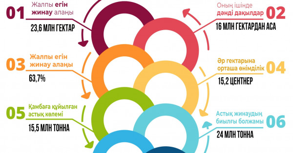 «Үкімет тарапынан жеңілдетілген қаржыландыру жасалып, қолайлы ауа райының нәтижесінде вегетациялық кезең сәтті өтті. Жалпы, егін жинау алаңы 23,6 млн гектарды құрайды, оның ішінде 16 млн гектардан астамы – дәнді дақылдар. Егін жинау жұмыстары уақтылы басталып, өткен жылмен салыстырғанда қарқынды жүріп жатыр. Бүгінде республика бойынша жалпы егін жинау алаңының 63,7%-ы жиналды, орташа өнімділік гектарына 15,2 центнерді құрады. 15,5 млн тонна астық қамбаға құйылды. Жалпы, 24 млн тонна астық жинаймыз ба деген болжам бар. Бұл ішкі нарықтың азық-түлік, жем-шөп, тұқымдық қажеттілігін толық қамтамасыз етуге әрі экспорт көлемін сақтауға мүмкіндік береді», деді А.Сапаров.