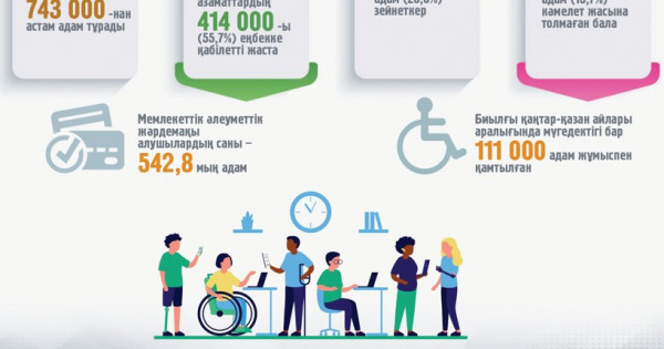 ەڭبەك جانە حالىقتى الەۋمەتتىك قورعاۋ مينيسترلىگىنىڭ مالىمەتىنشە 743,9 مىڭ مۇگەدەكتىگى بار ازاماتتىڭ 414 مىڭى (55,7%) – ەڭبەككە قابىلەتتى جاستا, 212,9 مىڭ ادام (28,6%) – زەينەتكەر. سونىمەن قاتار 117 مىڭ ادام (15,7%) – كامەلەت جاسىنا تولماعان بالا. مۇگەدەكتىگى بار ادامداردىڭ ءومىر ءسۇرۋ ساپاسىن ارتتىرىپ, ولاردى الەۋمەتتىك تۇرعىدان قولداۋ ماقساتىندا مەملەكەت تاراپىنان كەشەندى شارالار قابىلدانىپ, جۇيەلى جۇمىستار اتقارىلىپ كەلەدى. مۇگەدەكتىگى بار ادامداردىڭ قۇقىقتارى مەن زاڭدى مۇددەلەرىن قامتاماسىز ەتۋ الەۋمەتتىك كودەكس اياسىندا جۇزەگە اسىرىلادى.