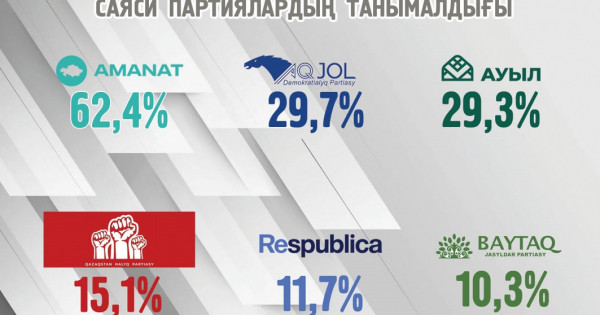 ەلدەگى ساياسي پارتيالاردىڭ ىشىنەن «Amanat» پارتياسىن 62,4 پايىز قاتىسۋشى اتاپ وتكەن. ودان سوڭ حالىق «اق جول» (29,7 پايىز) مەن «اۋىل» (29,3 پايىز) پارتيالارىمەن جاقسى تانىس. ال رەسپوندەنتتەردىڭ 17 پايىزى قازاقستان حالىق پارتياسىن, 15,1 پايىزى «Respublica» پارتياسىن, 11,7 پايىزى «بايتاق» پارتياسىن بىلەتىنىن ايتقان. جالپىۇلتتىق سوتسيال-دەموكراتيالىق پارتياسىن قاتىسۋشىلاردىڭ 10,3 پايىزى عانا بەلگىلەگەن.