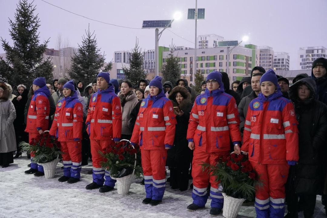 استانا قالالىق جەدەل مەديتسينالىق جاردەم ستانتسياسىنىڭ قىزمەتكەرلەرى ەسكەرتكىش تاقتا الدىنا گۇل شوقتارىن قويدى.