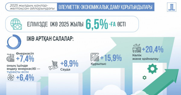 قۇرىلىس سالاسىندا ءوسىم 15,9%-دى قۇرادى, بۇل 2025 جىلعى قاڭتار-قاراشا (14,7%) كورسەتكىشىنەن جوعارى. ءوسىم تۋرالى مەكتەپتەر, مەديتسينالىق نىساندار, كولىك پەن ينجەنەرلىك ينفراقۇرىلىمدار سالۋدى قوسا العاندا, ينفراقۇرىلىمدىق جانە الەۋمەتتىك جوبالاردى جۇزەگە اسىرۋمەن قامتاماسىز ەتىلگەن. قاڭتار-جەلتوقساندا پايدالانۋعا بەرىلگەن تۇرعىن ءۇيدىڭ جالپى اۋدانى 20,1 ملن شارشى مەتردى قۇرادى, بۇل 2024 جىلعى دەڭگەيدەن 5,1%-عا جوعارى.