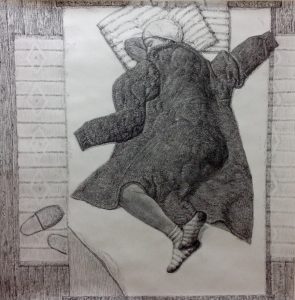 «قارا شاپان –جاۋىندا اكەم, ساۋىندا شەشەم كيگەن,سول شاپاننىڭ قوينىنا شەكەر دە ۇيگەم.جاماۋ-جاماۋ ءبىز كورگەن بالالىقتاي,قايدا قالدى شاپانىم كوشەردە ۇيدەن؟». جاس اقىن ەرىك نارىننىڭ وسى ولەڭى كارتيناداعى بوياۋمەن ۇندەسەتىن سەكىلدى. ءبىر دەتالمەن-اق تىرلىكتىڭ قاسىرەتىن كورسەتۋ, ونى جۇرەكپەن سەزىنۋ قيىن دۇنيە. بىراق جان تولعانىسىڭىز ءتۇس بولىپ توگىلگەندە كەنەپ بەتىندە ەركىن قالىقتايسىز.