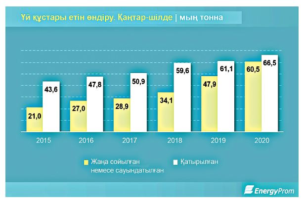 بيىلعى 6 ايدا ەلىمىزدەگى قۇس فەرمالارىندا سالقىنداتىلعان قۇس ەتىنىڭ ءوندىرىسى جىلىنا 26 پايىزعا, ال قاتىرىلعان ەت ءوندىرىسى 9 پايىزعا ءوستى. سوعان قاراماستان شەتەلدەن كەلەتىن قۇس ەتىنىڭ كولەمى دە ارتىپ كەلەدى. بۇل تۋرالى energyprom.kz حابارلادى.