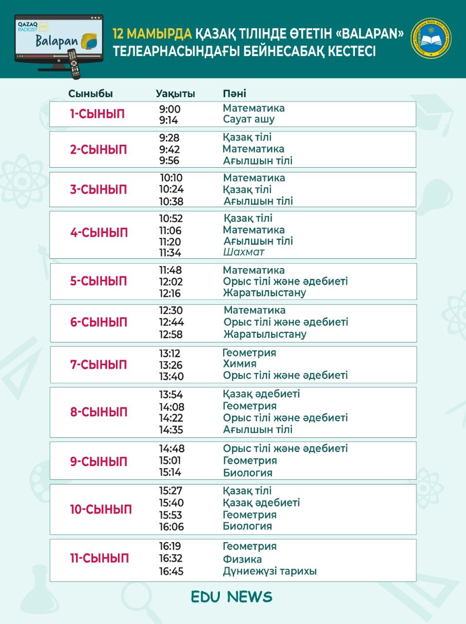 مەكتەپ وقۋشىلارىنا 12 مامىرعا ارنالعان بەينەساباقتار كەستەسى