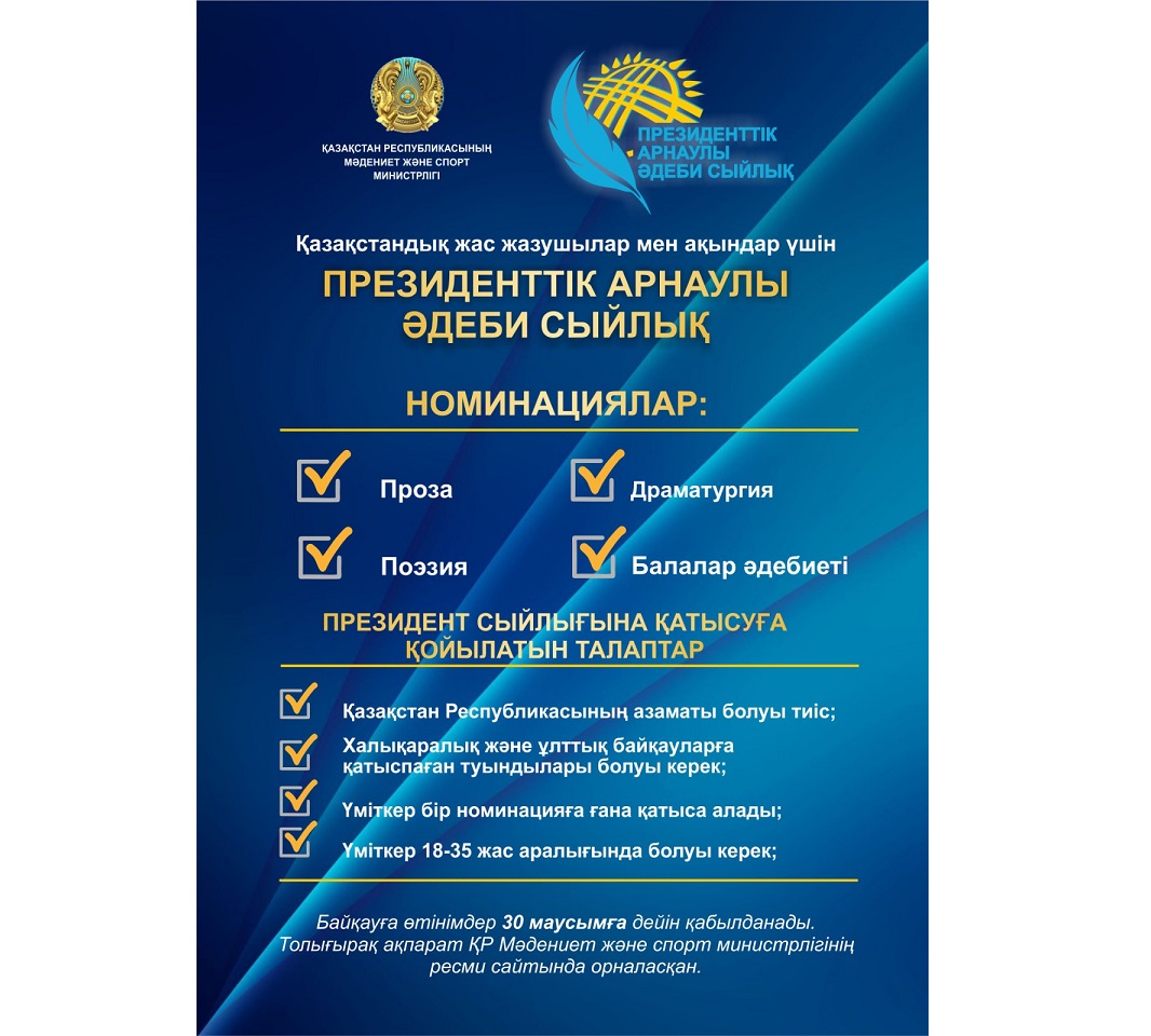 بيىل جاس قالامگەرلەرگە مەملەكەتتىك قولداۋ كورسەتۋ جانە ولاردىڭ جاڭا بۋىنىن قالىپتاستىرۋ ماقساتىندا تۇڭعىش رەت پرەزيدەنتتىك ادەبي سىيلىق تاعايىندالىپ وتىر.