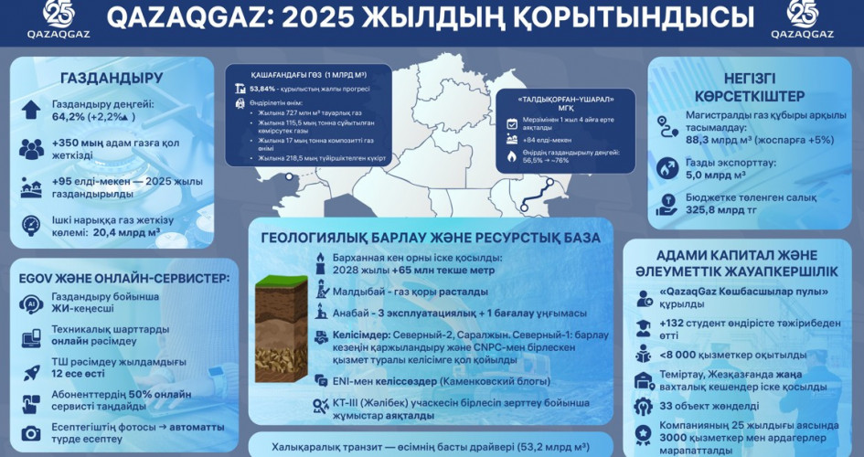 بيىل «QazaqGaz» ۇلتتىق كومپانياسى گەولوگيالىق بارلاۋ, كۇردەلى قۇرىلىس جوبالارىنا دەن قويدى. بۇل سايكەسىنشە گازدى ىشكى تۇتىنۋدىڭ ارتۋىنا, ەلىمىزدىڭ گاز قورى اۋقىمىن كەڭەيتۋ قاجەتتىلىگىنە بايلانىستى بولدى. 2025 جىلداعى باسىمدىقتار قاتارىندا گاز ينفراقۇرىلىمىن نىعايتۋ, «QazaqGaz Aimaq» اق ارقىلى استانا مەن ونىڭ اگلومەراتسياسىن ودان ءارى گازداندىرۋ جونىندەگى جوبالاردى ىسكە اسىرۋدى قوسا العاندا, وڭىرلەردى كوگىلدىر وتىنمەن قامتۋ كوزدەلدى.