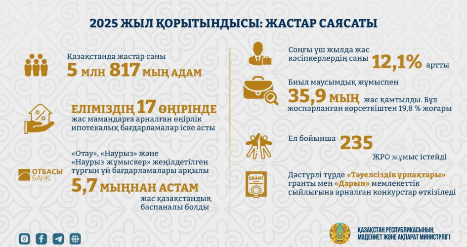 قازىر ەلدە 5 ميلليون 817 مىڭ جاس ءومىر ءسۇرىپ جاتىر. بۇل – جالپى حالىقتىڭ ۇشتەن ءبىر بولىگى. مۇنداي اۋقىمدى دەموگرافيالىق الەۋەت – كەز كەلگەن مەملەكەت ءۇشىن ءارى مۇمكىندىك, ءارى ۇلكەن جاۋاپكەرشىلىك. سوندىقتان بۇگىنگى جاستار ساياساتى تەك الەۋمەتتىك قولداۋ شارالارىنىڭ جيىنتىعى ەمەس, قازاقستاننىڭ ۇزاقمەرزىمدى دامۋىن ايقىندايتىن ستراتەگيالىق باعىتقا اينالىپ وتىر.