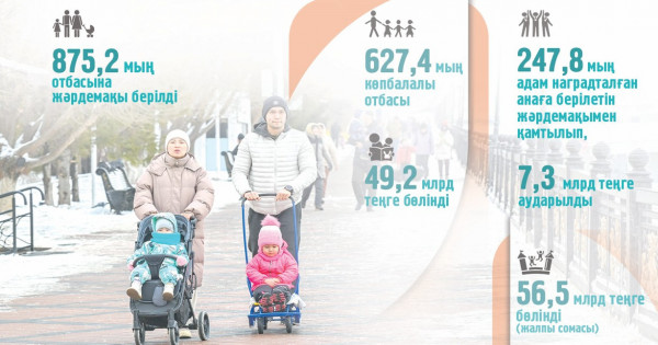 Көпбалалы отбасылар жәрдемақысы 627,4 мың отбасына (49,2 млрд теңге) берілсе, марапатталған анаға берілетін жәрдемақымен 247,8 мың адам қамтылып, бұған 7,3 млрд теңге аударылды.