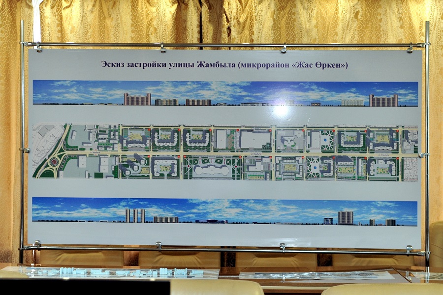 Жамбыл көшесінде бой көтеретін «Жас өркен» шағынауданының жоба үлгісінде аумақты жаңа нысандармен қамту, гүлзарлармен көркейту, ескі ғимараттардың қасбетін жақсарту шаралары қарастырылған. Жол-көлік жөндеу жұмыстары аяқталғаннан кейін айналма жолдың дәл жүрек тұсына батыр бабамыз Қожаберген жырауға арнап еңселі ескерткіш орнатылады. Оның биіктігі 14 метрге дейін жетеді. Бұдан тысқары өндірістік аумақтағы қоршау бойына ағаштар мен тірі бұталы қоршау егу арқылы шағын гүлзармен көркейтіледі, жаяужолдар жасалады, шамдар мен орындықтар орнатылады. Жекелеген нысандардың қасбеттері сәулеткерлік әйнектеуді қолдану арқылы керамикалық мәрмәртаспен көмкеріледі. Осы аумақтағы көшелердің орамы аумағында 384, 312 және 332 пәтерлік тұрғын үй кешені тұрғызылады. Қазір 4 қабатты теннис орталығы мен 9 қабатты прокуратура ғимаратының құрылысы жүргізілуде.