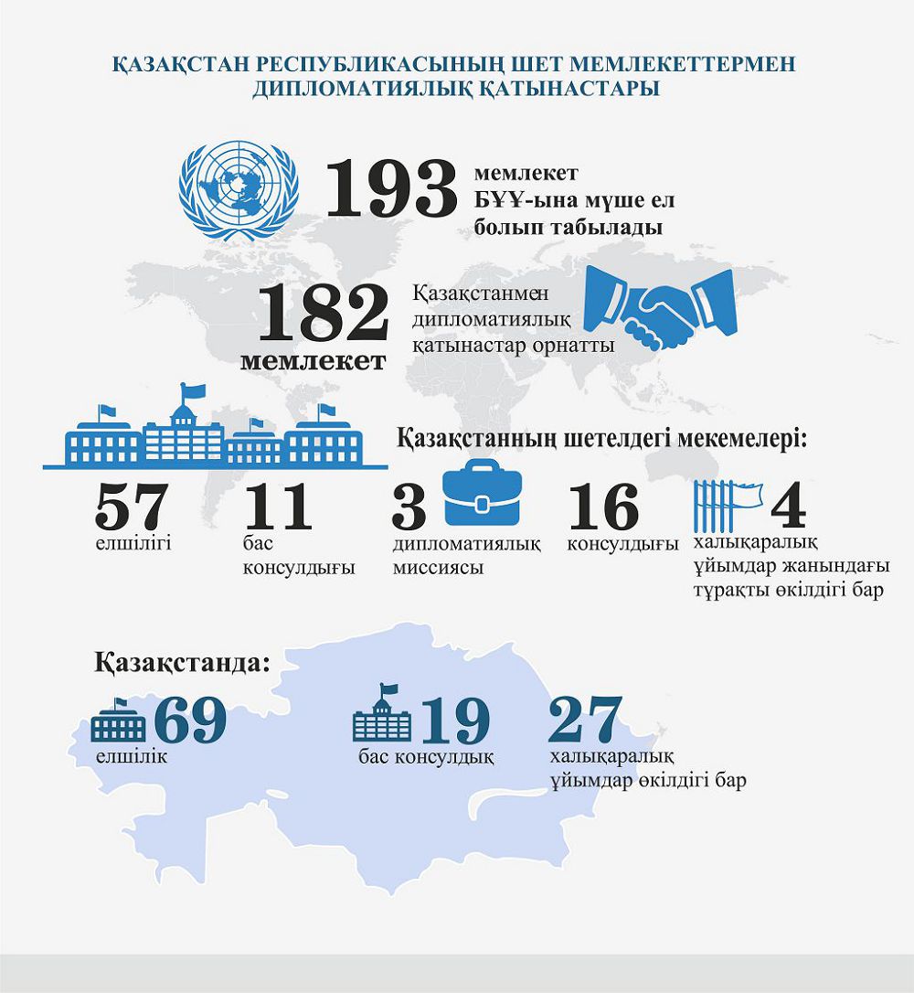 Қазақстан көршілес елдермен де, шалғайдағы елдермен де достық, өзара тиімді қатынас жасай алды. 182 мемлекетпен дипломатиялық қатынас орнатылды.