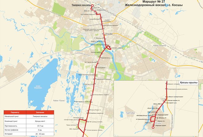 «Қарасу көшесі» аялдамасынан Ұлытау көшесіне дейін қозғалыс жүзеге асырылады, әрі қарай Ақмола көшесі – Сарыөзен көшесі- Н. Тілендиев даңғылы – Ш. Бейсеков көшесі, Ш. Айтматов көшесі – Орынбор көшесі – Сығанақ көшесі – Сауран көшесі, Керей көшесі, Жәнібек хандар көшесі – Мәңгілік ел даңғылында оңға, 31 көшесі, соңғы аялдама – «Клиникалық-оңалтау кешені».