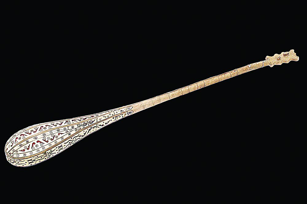 Перне тағылған қу мойнының шанақпен құйысқан тұсынан бас­тап, қос шектің бітеу тұйығы бе­­кітілген шегесіне дейін дом­быраның сырты сүйекпен көм­керілген. Бір ерекшелігі – сүйек сәндік үшін жапсырылғаны бол­маса, аспаптың саздық дыбыс-үніне ешбір қатысы жоқ сияқты. Ма­мандар солай дейді.