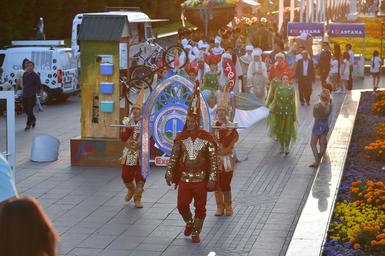 Еліміздің тарихынан сыр шертетін сазды керуен «Ғашықтар» алаңынан «Бәйтерек» алаңына дейінгі аралықты қамтыды.
