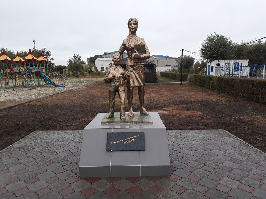 Мұғалімдер күні қарсаңында ашылған бұл ескерткіштің идеясы аудандағы білім саласы ардагерлерінен шығыпты. Бастаманы барша жұрт қолдап, аудандағы білім саласы қызметкерлері біркүндік еңбекақысын аударған. Туындыны аудандағы талай ескерткішті сомдап шыққан шебер Зәкіржан Исламбеков жасаған.