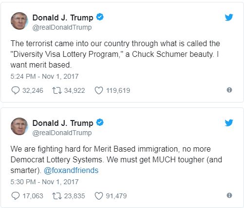 Трамп өз туиттерінің бірінде грин карта бағдарламасын қатты сынап, оны Шумердің "туындысы" деп атады. Ал Чау Шумер 2013 жылы грин карта лотореясын жою туралы заң жобасы авторларының бірі екенін де айта кету керек. Ол кезде заңды сенат қабылдағанымен, өкілдер палатасында республикалықтар қарсылық танытты.