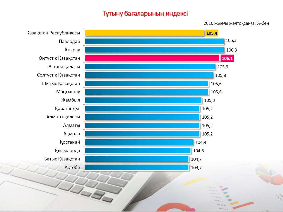 Бұдан бөлек, облыста азық-түлік тауарларының бағалары мен тарифтері 4,3 пайызға, ал азық-түлік емес тауарлар 8,6 пайызға өскен. Халыққа көрсетілетін ақылы қызметтер 5,8 пайызға қымбаттаған.