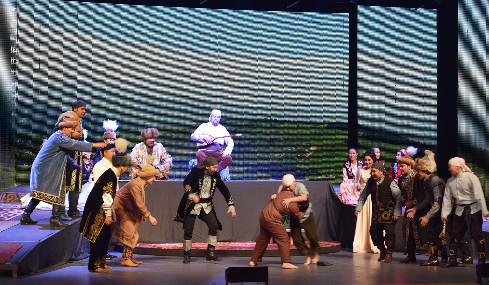 Сахна шымылдығы: «Халқым!.. Қайда барсам да елімнен сый көремін. Сол үшін әлім жеткенше аянған емеспін. Барымды елім үшін жұмсап өтсем, арманым не?..» дейтін Әсеттің өз сөзімен ашылып кәусар өнерге сусап келген көрерменнің көңілін бірден баурап алды. Оқиға әрі қарай тарихымыздағы «Қоянды», «Қарқара» жәрмеңкелерін көрсету арқылы халқымыздың қазыналы бай мұрасын, ұлттық ойындарын, таным-тарихымыздан сыр шертетін дәстүрлі өнерін Әсет өмірімен сабақтастыра суреттейді. Кез келген қазақы жиын-тойдың шұрайын келтіретін бұқа тартыс, күрес, ақындар айтысы сияқты бәсі биік ұлттық өнеріміз бен дәстүрлеріміз қойылымда кеңінен көрініс тапқан.