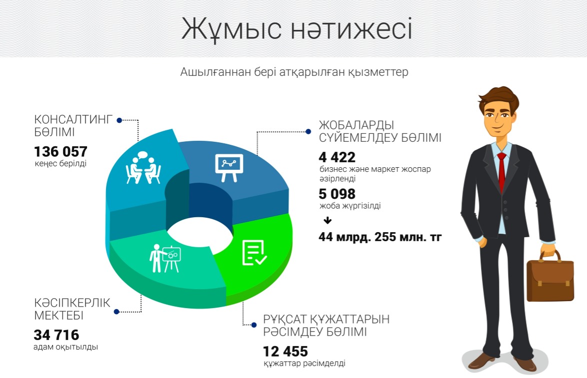 Ағымдағы жылдың осы уақытына дейін қаржыландыру шарттарын түсіндіру аясында 285 кәсіпкердің қатысуымен 16 кездесу ұйымдастырылыпты. Бүгінгі таңда кәсіпкерлер мен ынталы тұлғалар орталықта кеңестерді тегін «бір терезе» қағидасы бойынша алып келеді.