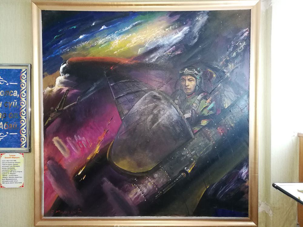 Міне, осындай жетістікті жемісті жылдар ішінде бірегей басшы Қауаз Мұқажанов Жәмші ауылына Бексейіт Түлкиевті де арнайы шақыртып, қаламақы төлеп, майлы бояуда бірнеше сурет салдыртыпты. Солардың ішінде Түлкиевтің тырнақалды туындысы «Көкпардың» да қайта салынған, толықтырылған нұсқасы бар. Әңгімеміздің басында айтып кеткендей, Жәмші ауылы бүгінде қазақтың ерлігі елге үлгі батырларының бірі Нұркен Әбдіровтің атында. Қылқалам шебері Жәмшіге келген сапарында Нұркен батырдың ерлікпен жау базасына өзінің жартылай өртеніп бара жатқан ұшағын бағыттаған сәтін де өз қиялында сәтті бейнелеген.