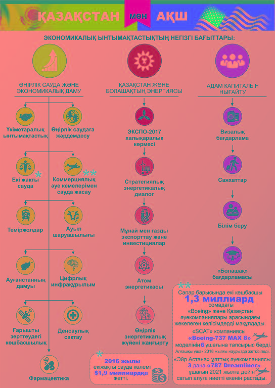 Екіжақты сауда. 2016 жылы екіжақты сауда көлемі 1,9 миллиард АҚШ долларына жетті. Екі ел сауда қатынастарын одан әрі кеңейтуге бейілдік танытты. АҚШ Қазақстанның азаматтық авиация туралы екіжақты келісімге қол қою ниетін құптайды. Бұл келісім әуе жолаушыларына қолжетімді, ыңғайлы және тиімді қызмет ұсына отырып, экономикалық қатынастарды нығайтады және іскерлік байланыстардың өсуіне ықпал ететін болады.