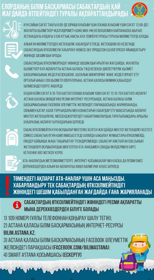 «Сабақ өткізілмейтін күні оқушылар мектепке келген жағдайда білім ордасының басшылығы сабақтың кестеге сәйкес өтуін қамтамасыз етеді (алайда, бақылау жұмыстары өткізілмейді, пәндер бойынша жаңа тақырыптар түсіндірілмейді). Сабақтар аяқталған соң сынып жетекшілері оқушылардың үйлеріне ата-анасымен (заңды өкілдерімен) бірге қайтқанына көз жеткізуі керек. Ата-аналарға метеомәліметтерге, интернет-қосымшалар мен ресми емес өзге дереккөздерден алынған ақпараттарға назар аудармауға кеңес беріледі», - делінген инфографикада.