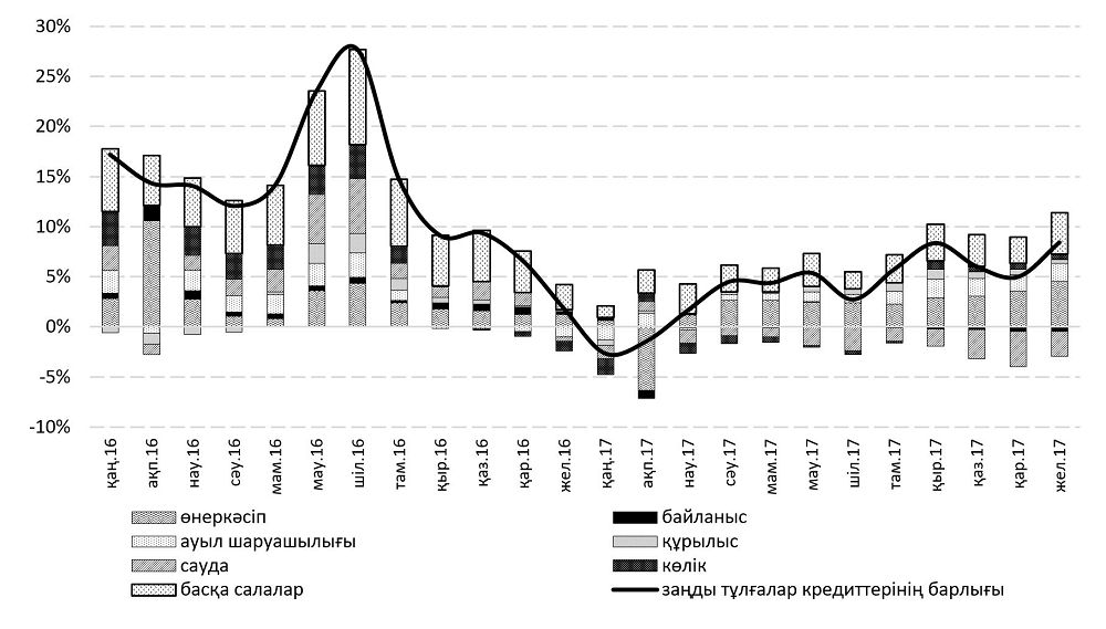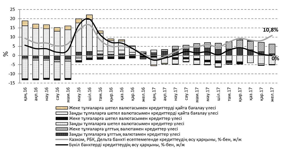 Банктердің 2016 жылы экономикаға кредит беруінің төмендетілген үрдісі 2017 жылы өсумен ауысты. Бұл ретте осы екі жылдың үрдістері арасындағы ерекшелік 2016 жылдың ортасында байқалған өсудің банктердің кредиттік белсенділігінің нәтижесі емес, ұлттық валютаның екі есеге жуық құнсыздануынан кейін валюталық кредиттерді айтарлықтай қайта бағалау нәтижесі болып табылады. 2017 жылы өсу барынша сапалы болды және ол банктердің экономикаға кредит беру процесін қайта бастауымен байланысты орын алды.