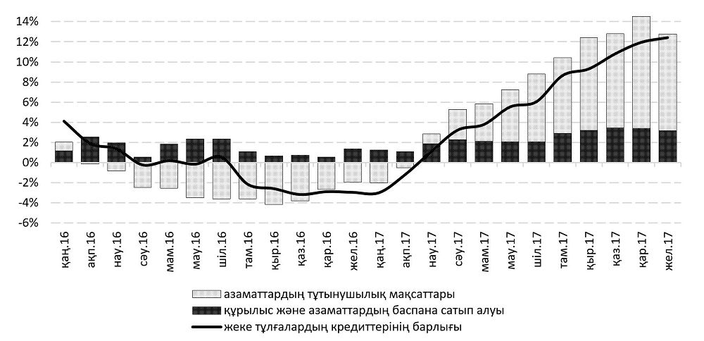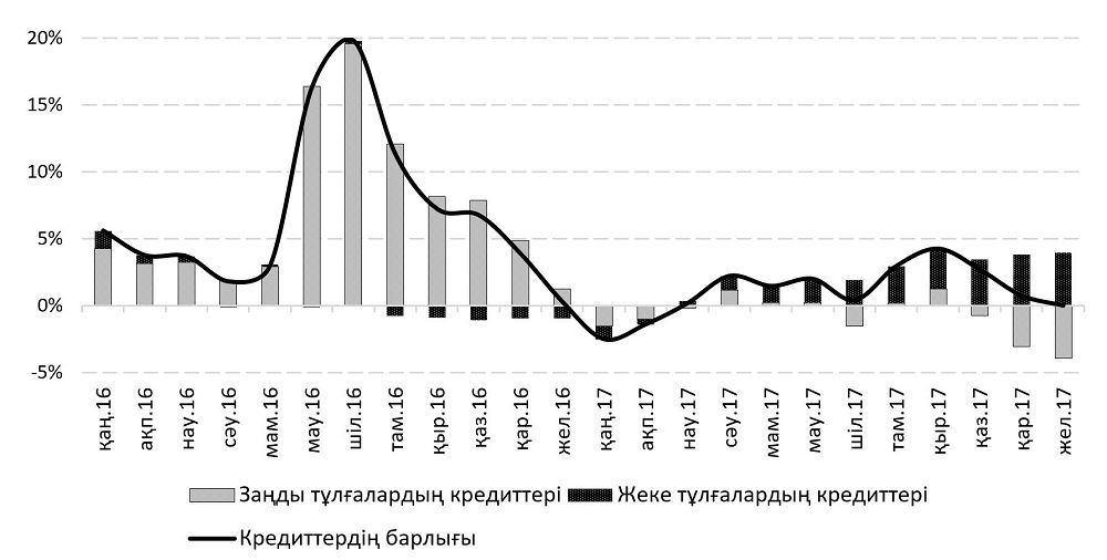 Банктердің кредиттік портфельдерінің сапалық сипаттамалары тұрғысынан алғанда, 2016 жылдың соңында валюталық кредиттерді қайта бағалау әсері толық аяқталғаннан кейін теңгемен кредиттеудің қайта басталуы маңызды жағдай болып табылады. Банктердің кредиттік портфелінің дәл осындай өсуін «саламатты» деп атауға болады. 2017 жылы кредиттеу нарығы дамуының басқа ерекшелігі ретінде жеке тұлғалардың банктердің жалпы кредиттік портфелінің өсуіндегі айқындаушы үлесін атауға болады. (2-сурет)