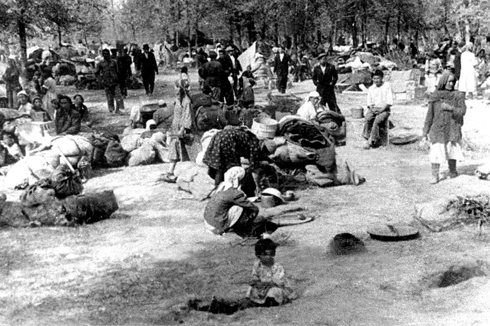 Сөренің жиегін жағалай орналастырылған фотоларды сүзіп келе жатып, мына бір суретке көзіміз түсті. Тал-терекпен көмкерілген жадағай алаңқай, жыпырлаған адам, қазылған жерошақ, асылған қазан, теңнен ағытылған бумалар...