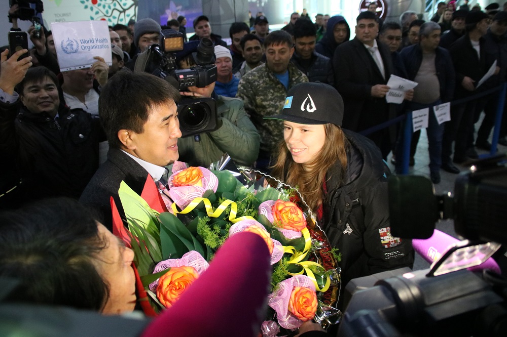 Байрақты бәсекеде ел намысын абыроймен арқалаған Отандасымызды құттықтауға Алматы әуежайына жиналғандардың сапында спорт жанкүйерлері, журналистер мен қала тұрғындары болды. Голышевадан бөлек Олимпиада ойындарына қатысқан Павел Колмаков, Денис Тен, фристайл могулдан Қазақстан ұлттық құрама командасының жаттықтырушылары, сондай-ақ шаңғы акробатикасынан ұлттық құрама мүшелері де елге оралды.