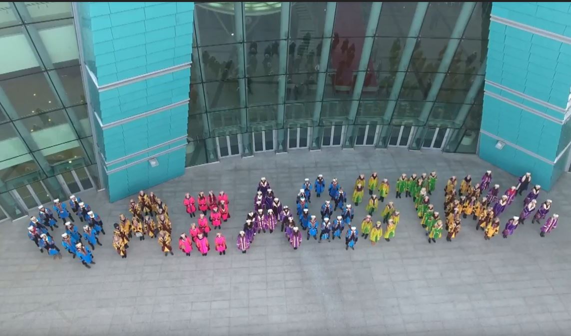 Елбасы қазақ тілі әліпбиін латын графикасына көшіру туралы Жарлыққа өзгеріс енгізгенін қолдау мақсатында Қазақ өнер университеті және «Қазақконцерт» ұжымының «Astana Musical» жас өнерпаздары флешмоб өткізді.