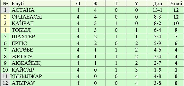 Өткен турда «Ақтөбемен» тең ойнаған алматының «Қайраты» бұл турда «Ақжайықты» 3:0 есебімен жеңді. Əзірге Алматының командасы үшінші орында келеді. Ал Шымкенттің «Ордабасы» осы турда да жеңіске жетіп, 12 ұпаймен көш басындағы «Астанамен» иық тіресіп келеді. «Ордабасы» – «Ақтөбе» 3:1.
