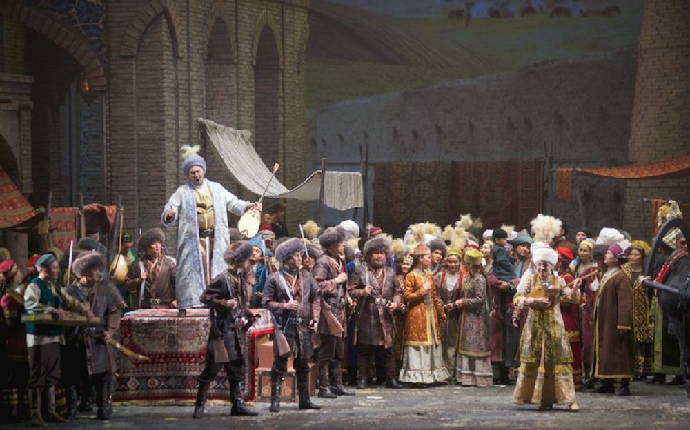 Той-думан көрінісімен басталған опера бірден көрерменнің қиялына қанат бітіреді. Шымылдық ашылғаннан-ақ пайда бола кететін жәрмеңкенің қайнаған қанбазары, ән-жырға толы думанды орта, өнерге құштар тойшыл қауым, дарынды халық зергерлері мен шебер қолөнершілер, цирк өнерінің хас шеберлері мен әккі саудагерлер сахнасы өзінің шынайлығымен, дәуір келбетін нанымды жеткізуімен айрықша есте қалды. Тіпті, шығарма түпнұсқасындағы молдалар бейнесінің қойылымның жаңаша оқылымына сай билер рөліне ауысуы да өз бедерімен шынайы һәм қызықты.