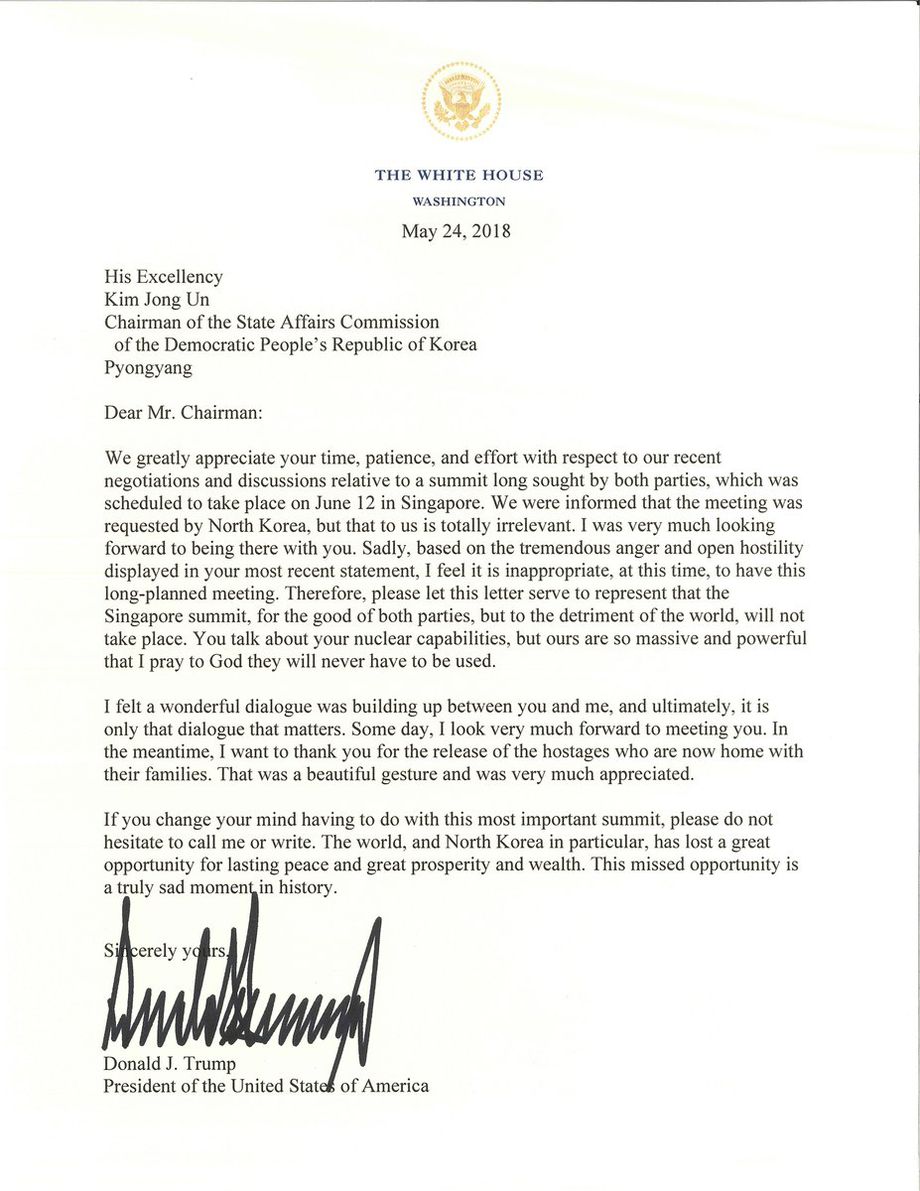 Трамп бейсенбі күні кездесу болмайтынын айтып, Пхеньянға хат жолдады. Ол "қазір кездесу өткізуге ыңғайлы уақыт емес" деп неліктен кездесуден бас тартқанын түсіндірген.
