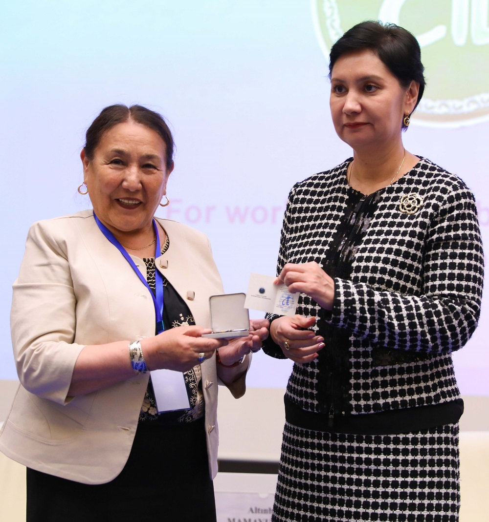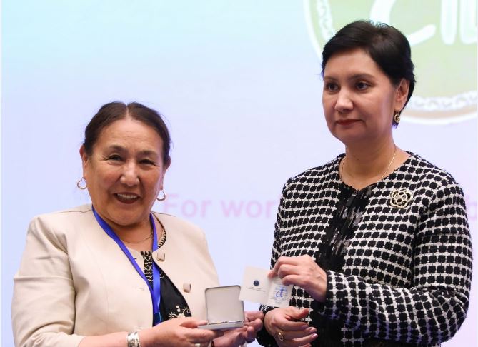 Филология ғылымдарының докторы, профессор, Ресей Ғылымдар академиясының Уфа ғылыми орталығы Тарих, тіл және әдебиет институтының ғылыми жетекшісі Фирдаус Хисамитдиноваға (Ресей, Башқұрстан) алтын медальді Мемлекеттік хатшы Гүлшара Әбдіқалықова табыс етті.