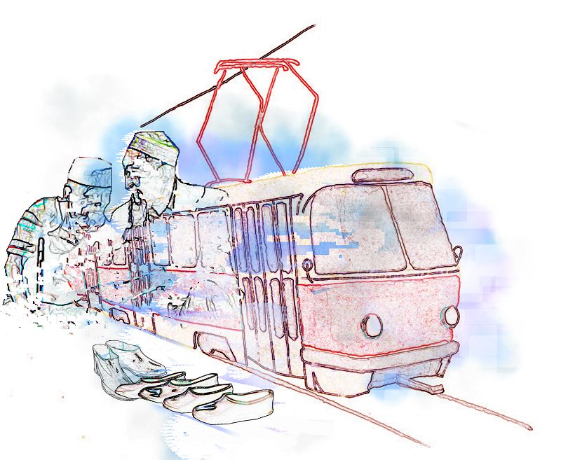 Содан әлгі кісілер аялдамаға келіп, өздері бұрын-соңды көрмеген «шайтан арбаны» күтеді ғой. Әне-міне дегенше ол да бір бұрылыстан зыр етіп шығады. Ол кезде елдің көзі енді-енді үйрене бастаған трамвай өте кұрметті көлік болса керек. Сондықтан да ішіне қып-қызыл «дорожка», яки біздің ауылдың тілімен айтқанда, кілемше төсеп қояды екен.