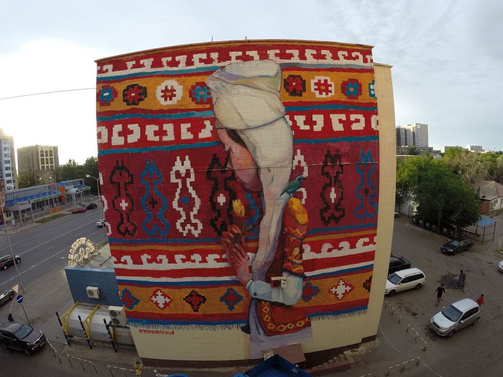 Қолына қызғалдақ ұстаған ұлттық киімдегі қыз Республика даңғылы, 34/2 мекенжайында орналасқан үйде салынды.