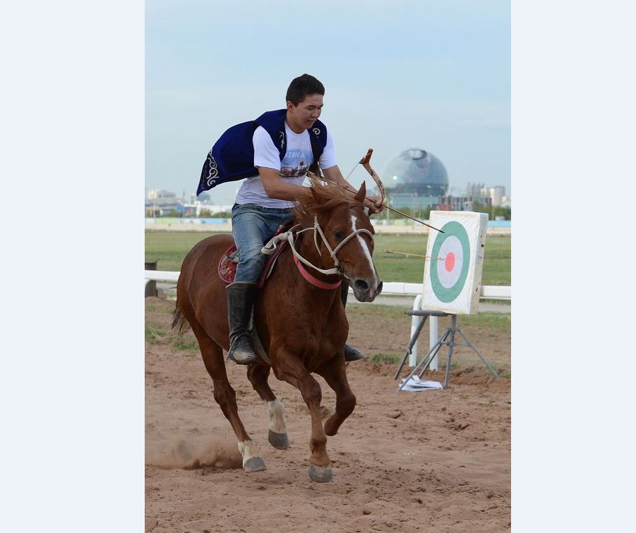 – Бұл өзіміздің ежелден келе жатқан «Жамбы ату» өнері, Яғни мұның басты ерекшелігі – нысана қозғалыста болуы. Бұл сайыста жамбының саны үшеу. Олар биіктігі 2,5 метрлік бағаналарға орнатылады. Бірінші тұрған қола жамбы 6 метр қашықтықта, күміс жамбы 8 метр қашықтықта, алтын жамбы 10 метр қашықтықта орналасады. Мерген жебесін қола жамбыға қадаса 5 ұпай, күміс жамбыға тигізсе 10 ұпай, алтын жамбыға дарытса 15 ұпай беріледі. Садақшыларға 3 мүмкіндік және әр мүмкіндікті орындап шығуға 16 секунд уақыт беріледі.