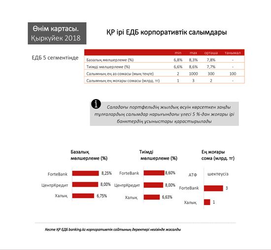 Тұтастай алғанда, екінші деңгейлі банктердің жетекші бестігінде шартты салымдарды қоса алғанда, мысалы, өндіруші сала кәсіпорындарының тарату қорын қалыптастыру үшін немесе ставкалары айтарлықтай төмен шетелдік жұмыс күшін тарту үшін заңды тұлғаларға әртүрлі өнімдер бар.