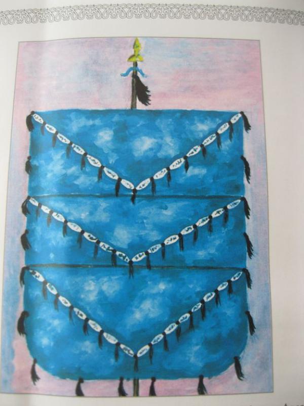 – امانگەلدىنىڭ مىڭباسى بولعان اتامبەكتىڭ ىبىرايى دەگەن كىسى بىردە ۇيگە كەلىپ, تۋدىڭ قاعازعا سالىنعان سۋرەتىن كورگەن سوڭ: «تۋدى اينىتپاي سالىپسىڭ, قاراعىم! تۋ وسىنداي بولاتىن» دەپ قۋانعان ەدى. كوزكورگەندەردىڭ ماعان سيپاتتاۋىنشا, تۋدىڭ ءتۇسى جالپى اق بولعانىمەن, ول بوز, كوكشىل تارىزدەنىپ, قۇبىلىپ تۇراتىن ماتا ەكەن. تۋ تومەن سالبىراپ تۇرعان, بەتىندە ءۇش بولەك, ءۇش تۇمارشا بولعان. ءار تۇمارشانىڭ جيەگىنە قۇران اياتى جازىلعان قۇستىڭ سۇيەگى بەكىتىلگەن. ال تۋدىڭ جيەگىنە جاعالاي سۋ سيىردىڭ (تەڭىز حايۋانى) قىلىنان شاشاق جاساپ ىلىنگەن. تۋدىڭ ۇشار باسىندا كولەمى شاي كەسەدەي كۇمبەز بەينەلى التىن اشەكەيى بولعان. اشارشىلىقتا ونى ساتىپ جىبەرسە كەرەك, – دەيدى ولكەتانۋشى.