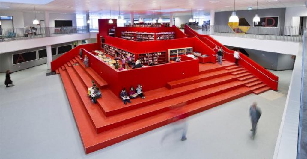 Қызыл пирамида түріндегі кітапхана мектеп ғимаратының ортасында, оқушылардың барлық негізгі жолдардың қиылысында орналасқан.