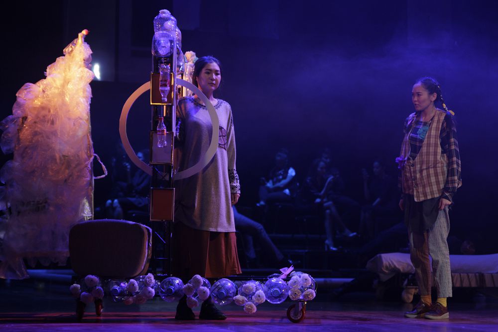 Баттасқан бояу мен бар құпиясын жайып сап тұрған тұрмыстық трактовкадан қашатын режиссер бұл жолы да шарттылықты негізге алады. Сахнада негізінен символ мен метафора сөйлейді. Екіге бөлінген контрасты кеңістікте бір-біріне қарама-қайшы екі әлем өмір сүреді. Сахна ортасынан орын алған ғимарат типтес жылтырақ әйнекпен көмкерілген алып декорация бүгінгі біз өмір сүріп жатқан қалалық өмірдің құйтақандай ғана бір бөлшегін көрсетсе, сол ғимаратты айнала қозғалған үш бейне спектакльге қосалқы автор болған қаламгерлер шығармасындағы кейіпкерлердің тағдыр-талайы арқылы берілген көмескілене бастаған құндылықтар көші. Жылтырақ әлемде өмір сүрген кейіпкерлердің бар ойы мен назары – ұялы телефон мен гаджетте. Айналасында болып жатқан түрлі оқиғаға, өздерін айнала қозғалған кейіпкерлердің қасіретті күйі мен трагедиясына һәм жан шырылына назарын салып та қарамайды. Тірі пендеге өмірдің бар қызығы ұялы телефонның ішіне тұрақтап қалғандай.