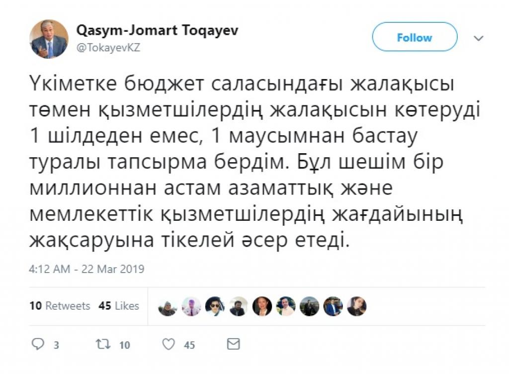 «Үкіметке бюджет саласындағы жалақысы төмен қызметшілердің жалақысын көтеруді 1 шілдеден емес, 1 маусымнан бастау туралы тапсырма бердім. Бұл шешім бір миллионнан астам азаматтық және мемлекеттік қызметшілердің жағдайының жақсаруына тікелей әсер етеді», деп жазды Президент.