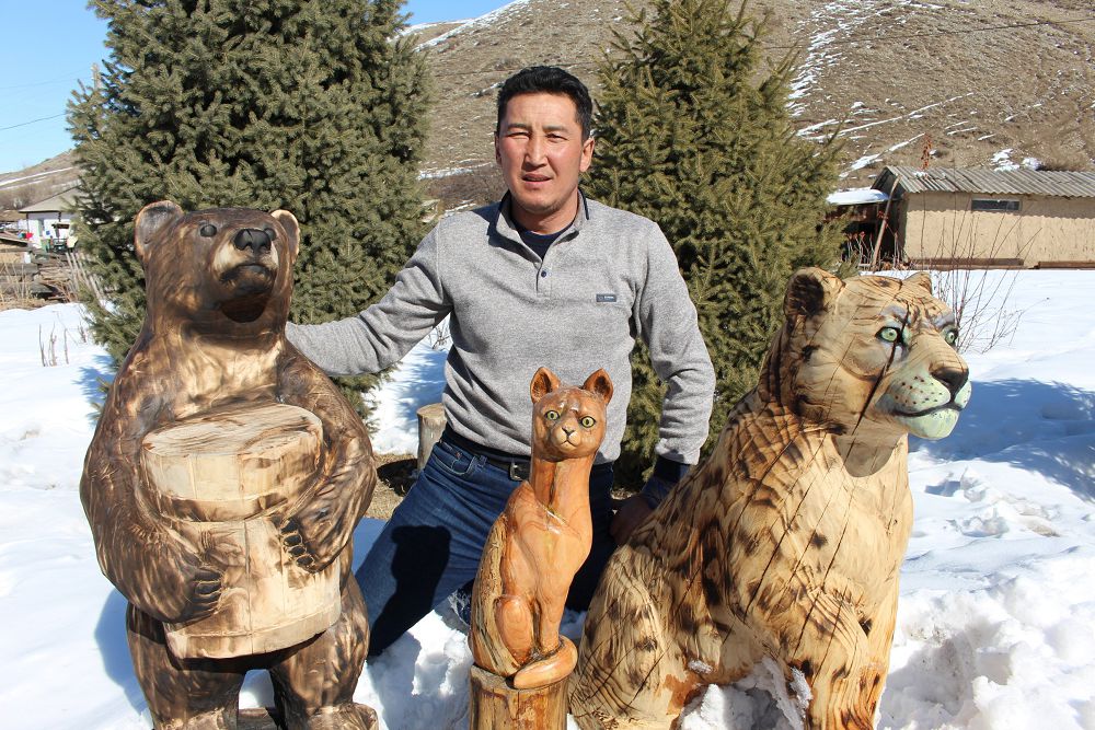 Ағаштан жасап шығатын аңдары тура өзінен айнымай көз тартып тұратыны қуанарлық. Оны қалаған түспен сырлап қойса, ұзақ жылдарға шыдас береді екен. Ержанға арнайы тапсырыс беріп жататын жандар да көп. Әсіресе, екі қабатты үйлері бар, есіктерінің алды алуан гүлмен, тал-терек, жеміс ағаштарымен көмкерілген сәнді аулаларда түрлі аңдардың әсіресе, еліктің мүсіндері тұрғаны ғажап-ақ. Ержаннан естігеніміздей бірсыпыра мүсіндері қоғам қайраткерлерінің есіктерінің алдында тұрған көрінеді. Рас, ағаштан айлап, апталап маңдай терлете жасап шығатын мүсіндердің бағасы да өзін-өзі ақтайтын дәрежеде болады екен. Өйткені бұл ерінбей еткен еңбектің жемісінен құралады.
