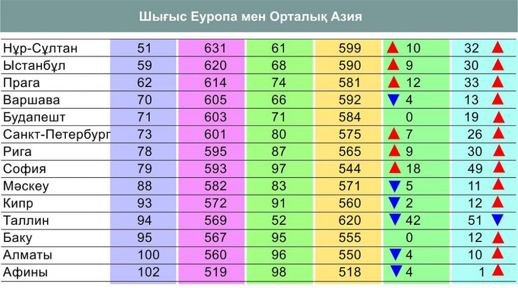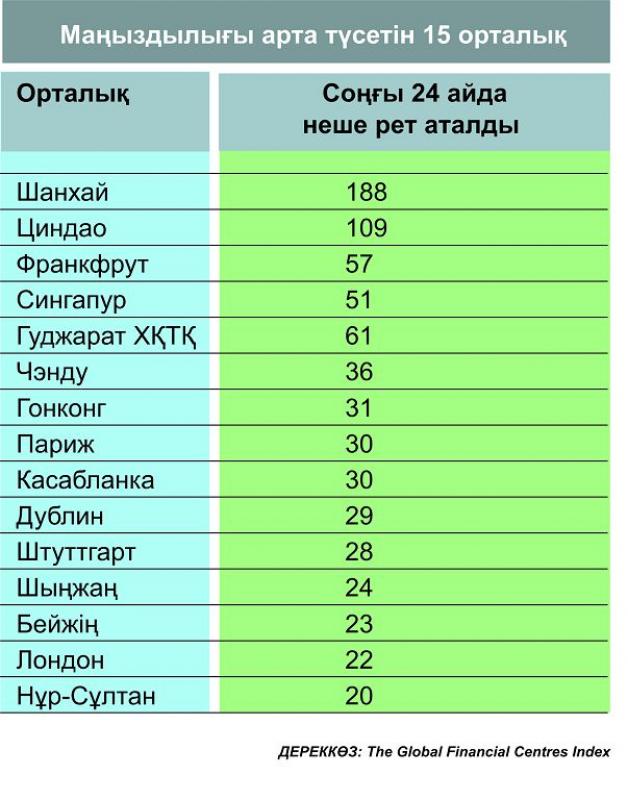 Елордамыз 80-нен астам ірі қаланың ішінде 51-орыннан көрінді. Бас қаланың бұлай өрлеуіне әлемнің қаржылық картасында «Астана» халықаралық қаржы орталығының пайда болуы ерекше ықпал етті деуге болады. «Астана» ХҚО жұмысын бастағаннан бергі аралықта 37 позицияға көтерілгені осыны айғақтайды. Тағы бір айта кетерлігі, Астана Шығыс Еуропа мен Орталық Азия аймағы бойынша рейтингте көш бастап тұр.