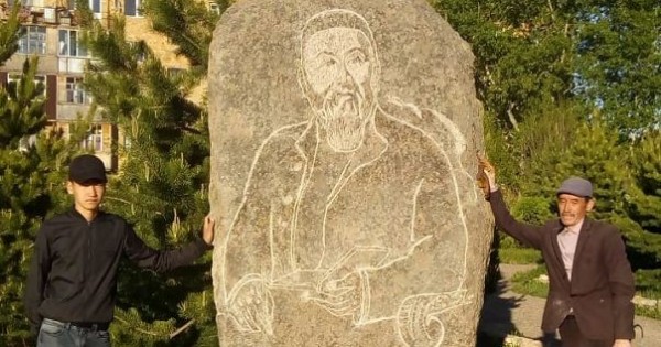Суретте: табиғи тасқа қашалған Абай бейнесі және авторлар.